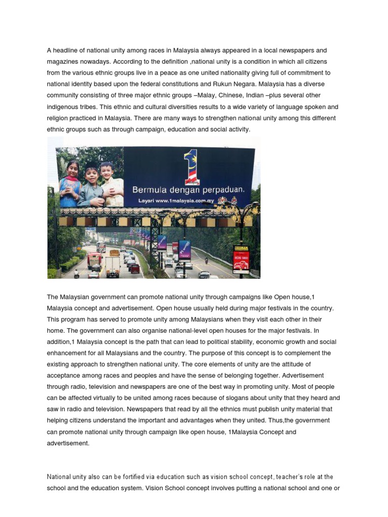 Advantages of 1malaysia concept. Najib said the combination of the two concepts was to avert confusion that the 1malaysia philosophy introduced in 2009 had been abandoned. In other words 1malaysia is a concept to foster unity amongst the multi ethnic rakyat of malaysia substantiated by key values that every malaysian should observe. The malaysia government believes on the direct effect assumption which the media can produce direct effect to the people. Malaysia is probably one of the very few that is banking a lot on government campaigns with the consistent usage of the 1malaysia concept.
