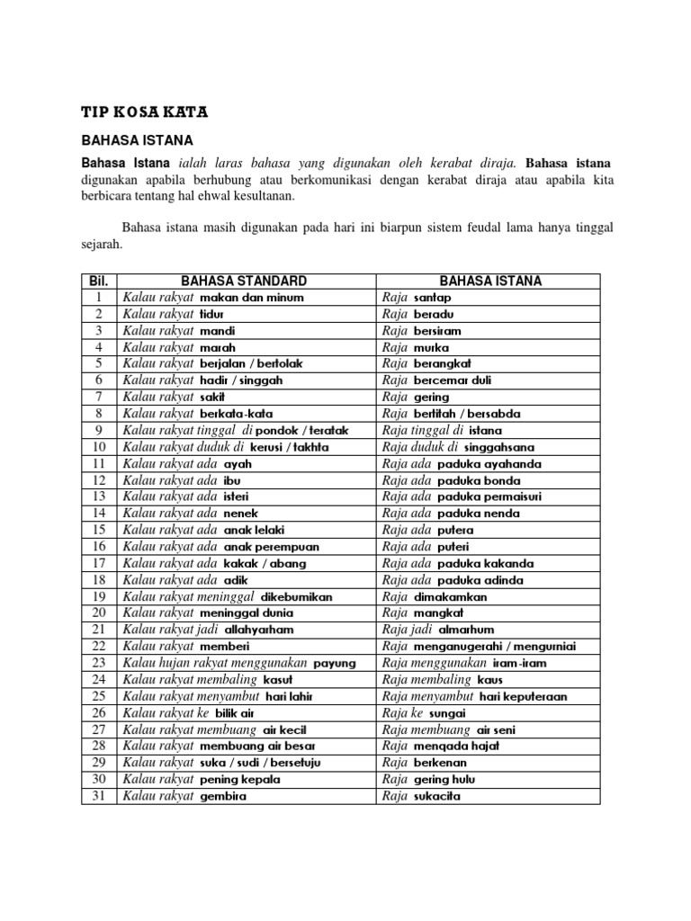 Contoh bahasa istana pt3 bahasa melayu bm. Oleh itu bahasa melayu klasik ialah bahasa yang berkembang selari dengan pengaruh agama islam di asia tenggara. Ia harus dipopularkan dan tindakan kementerian pendidikan malaysia kpm yang menekankan tahap kefahaman bahasa istana pt3 dikalangan pelajar tingkatan 3 yang menduduki peperiksaan pt3 2016 harus dipuji. Kerajaan malaysia dan bahagian khidmat pengurusan istana negara tidak akan bertanggungjawab ke atas apa apa kerugian atau kerosakan yang disebabkan oleh penggunaan mana mana maklumat yang diperolehi di portal ini.