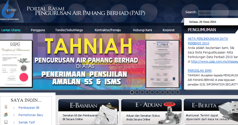 Laman web ini sesuai dilayari menggunakan chrome dan firefox 3 0 dengan resolusi skrin 1280 x 1024 piksel. Sila semak pusat e bayar di portal majlis perbandaran kuantan untuk mengetahui bil bil yang boleh dibayar di sini. Posted in semakan tips tagged air johor air kedah air kelantan air pahang air pulau pinang air terengganu aksb bayaran bekalan air pulau pinang laku paip sada sains saj holding samb satu semakan semakan dan bayaran bil secara atas talian syabas syarikat air darul aman sdn bhd syarikat air negeri web rasmi syarikat air. Ianya bertujuan memudahkan semua penyewa membuat bayaran sewa rumah pakr hanya atas talian tanpa perlu pergi ke kaunter bahagian perumahan pejabat setiausaha kerajaan pahang pejabat daerah dan tanah.