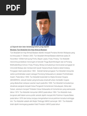 Biodata tun abdullah ahmad badawi. Tun abdullah ahmad badawi dilahirkan pada 26 november 1939. Biodata perdana menteri malaysia ke 5 abdullah bin ahmad badawi. Ia juga memimpin parlemen koalisi pemerintahan barisan nasional. Tun abdullah ahmad badawi dilantik sebagai perdana menteri malaysia yang kelima pada 31 oktober 2003 dan lebih dikenali dengan konsep islam hadhari.