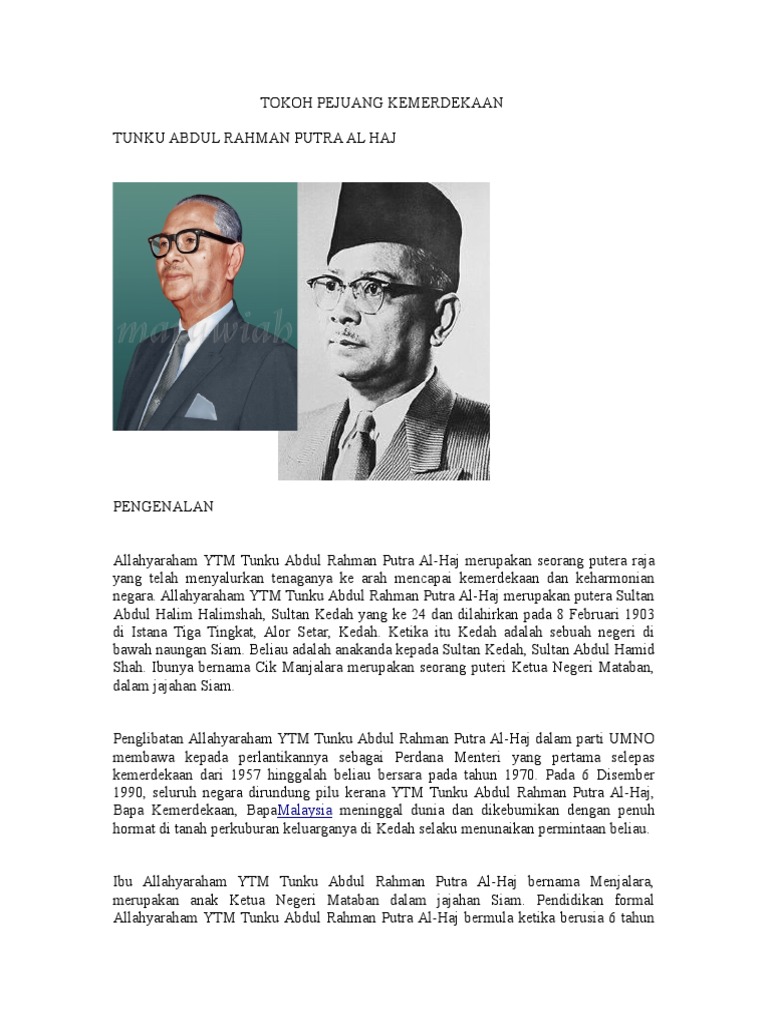 Puan habibah binti ismail. Tunku abdul rahman putra al haj ibni almarhum sultan abdul hamid halim shah merupakan seorang tokoh yang mempunyai sifat sifat istimewa disebalik kejayaannya beliau merupakan seorang yang peramah baik hati arif dalam membuat pertimbangan berjiwa rakyat setia kepada sahabat sahabatnya rendah diri murah hati sentiasa bersimpati bertanggungjawab serta banyak lagi nilai yang. Selepas pemimpin umno dipindah dari dato onn kepada tunku abdul rahman slogan hidup melayu diubah kepada merdeka sesuai dengan perubahan matlamat perjuangan umno semasa ingin menuntut kemerdekaan tanah melayu umno mca dan mic bergabung menjadi parti perikatan parti perikatan telah memenangi 51 daripada 52 kerusi dalam pilihan raya dan seterusnya mendapat sokongan orang ramai. Pendahuluan almarhum tunku abdul rahman putra al haj ibni almarhum sultan hamid shah 8 februari 1903 6 disember 1990 merupakan ketua menteri persekutuan tanah melayu dari 1955 dan perdana menteri pertama sejak kemerdekaan pada tahu.