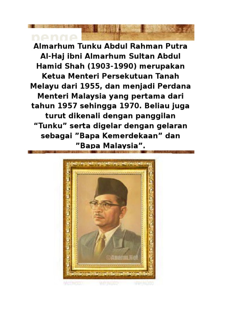 Tunku abdul rahman putra. 1916 penang free school penang. 5 arif nama cikgu. Almarhum tunku abdul rahman putra al haj ibni almarhum sultan abdul hamid shah 8 februari 1903 6 disember 1990 merupakan ketua menteri persekutuan tanah melayu dari 1955 dan perdana menteri pertama sejak kemerdekaan pada tahun 1957 sehingga 1970.