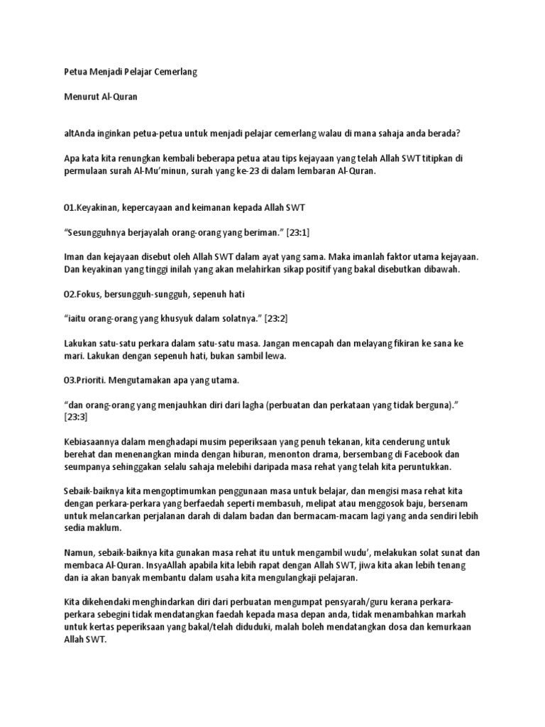 Cara cara menjadi murid cemerlang setiap orang mahukan keputusan yang cemerlang dalam peperiksaan. Seorang pakar psikologi pernah mengatakan bahawa lima puluh peratus kejayaan pelajar pelajar disebabkan faktor memberikan sepenuh tumpuan ketika proses pengajaran dan pembelajaran sedang dijalankan. Selamat sejahtera tuan pengerusi majlis yang berusaha tuan guru besar barisan hakim yang arif lagi bijaksana guru guru dan rakan rakan sekalian. Namun demikian kecemerlangan tersebut tidak dating dengan sendirinya sebaliknya perlu disusuli dengan usaha yang bersungguh sungguh.