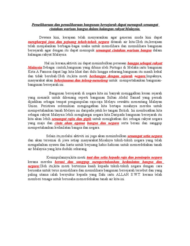 Cara memelihara dan memulihara bangunan bersejarah. Pembangunan di negara kita semakin hari semakin maju dan pesat seiring dengan nama malaysia yang kini berjaya menempa nama di persada antarabangsa. 30792 hits langkah langkah untuk memelihara memulihara bangunan binaan bersejarah sila klik usaha usaha memelihara dan memulihara bangunan bersejarah usaha usaha memelihara dan memulihara bangunan bersejarah langkah langkah pemeliharaan dan pemulihara. Semoga perkongsian bahan bahan rujukan panduan bahan pembelajaran dan pengajaran contoh contoh karangan sumber rujukan pt3 pentaksiran tingkatan 3 tingkatan 1 tingkatan 2 tingkatan 3 dalam post di blog bumi gemilang berguna dan dapat membantu para pelajar dan pengguna. Berikut adalah contoh karangan kepentingan memulihara dan mengekalkan bangunan bersejarah serta isi isi penting yang boleh digunakan dalam penulisan karangan sebagai rujukan dan panduan.