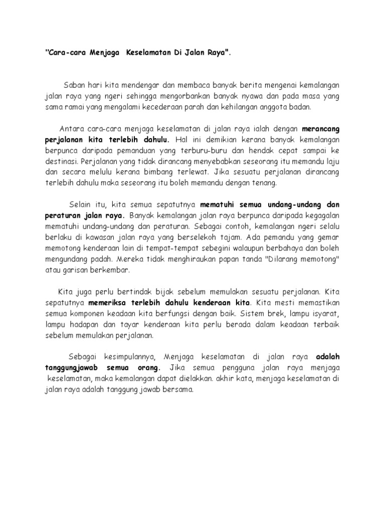 Ini dapat meningkatkan kesadaran siswa tentang pentingnya menjaga keselamatan di jalan raya. Hal ini disebabkan oleh tingkat kesadaran pengguna jalan raya yang semakin rendah. Cara cara mengurangkan kadar kemalangan jalan raya 1 cara cara menjaga buku teks 1 cara cara menjaga keselamatan diri 1 cara cara menjaga kesihatan 1 catatan abu afaf dedikasi untuk mak dan saudara saudaraku 1 catatan kehidupan 1 catatan perhimpunan pagi sekolah 1 contoh karangan jenis fakta faedah menabung 1. Banyak kecelakaan terjadi justru disebabkan oleh faktor kelalaian penggunanya.