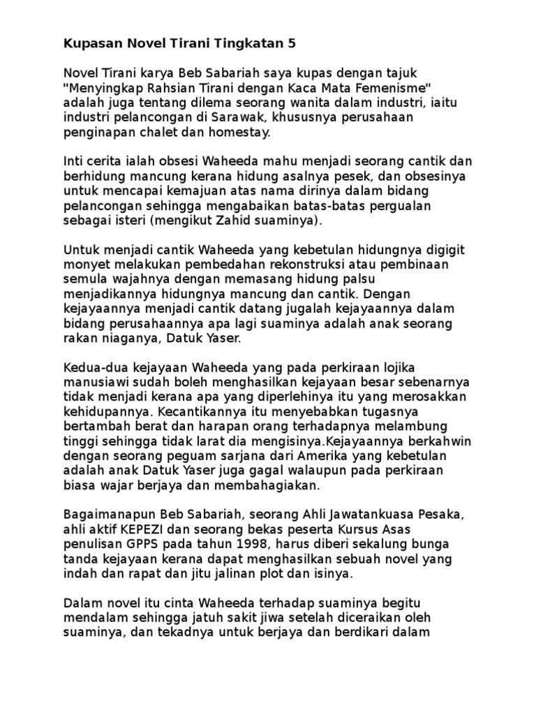 Teknik menjawab soalan novel spm bahasa melayu 1. Pengajaran yang terdapat dalam novel trani karya beb sabariah ialah kita mestilah berani membuat keputusan demi kesenangan masa depan. Percubaan spm sbp 2005. Plot novel tirani karya beb sabariah.