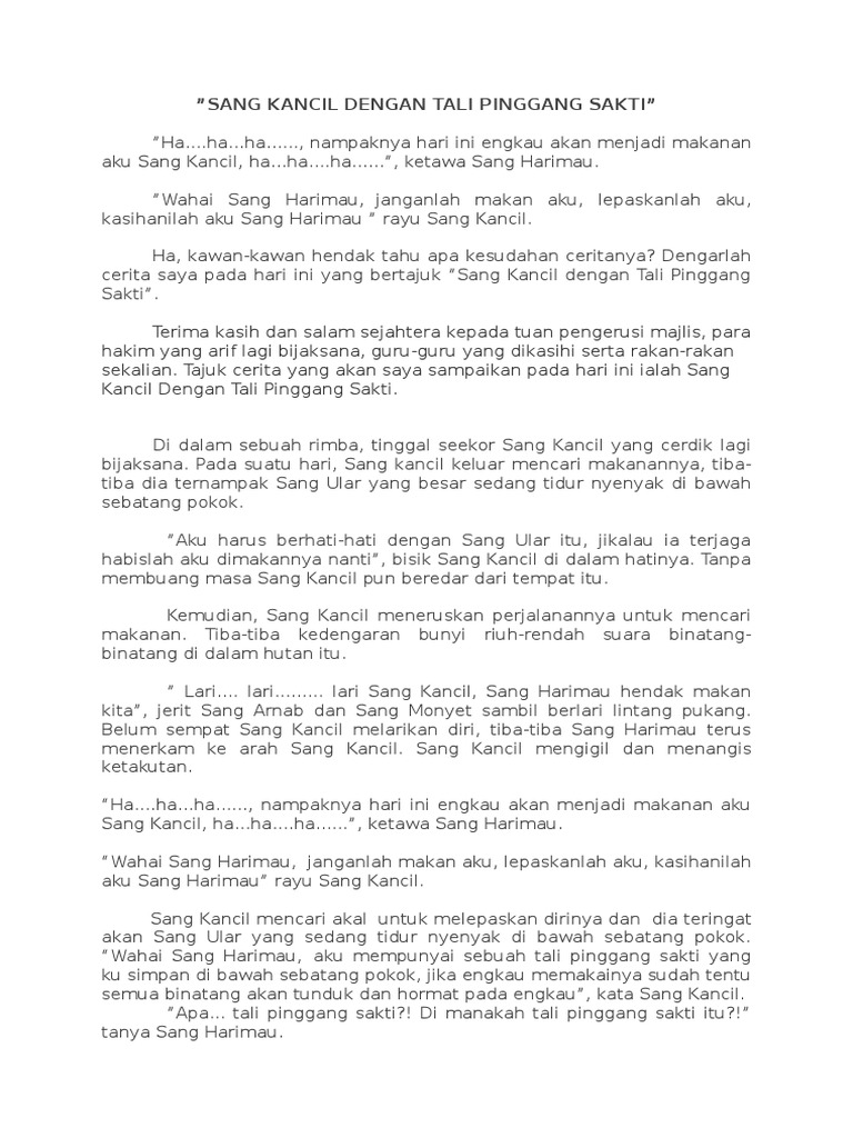 Cerita si kancil dan sang buaya. Cerita kancil dan buaya suatu hari ada seekor kancil sedang duduk bersantai di bawah pohon. Melompat kesana kemari sambil menyanyi. Sementara itu sang kancil terus melompat kegembiraan dan terus meninggalkan buaya buaya tersebut dan menghilangkan di dalam kebun buah buahan untuk menikmati buah buahan yang sedang masak ranum itu.