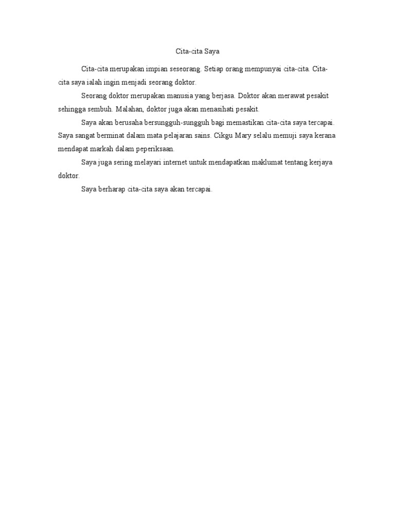 Contoh karangan cita cita menjadi dokter dalam bahasa inggris dan artinya to be a doctor is my dream since i was children because i think that if i would be an doctor we can help another person that sick and need help and also doctor is an profesion that merit because can help person that sick with the way relieve the disease or illness and make the patient back to normal condition. Saya bercita cita menjadi doktor kerana saya ingin membantu orang sakit. Selain itu cita cita ialah satu keinginan atau satu hasrat yang mendalam di dalam hati. Cita cita yang dipilih haruslah manfaat untuk diri masyarakat dan negara.