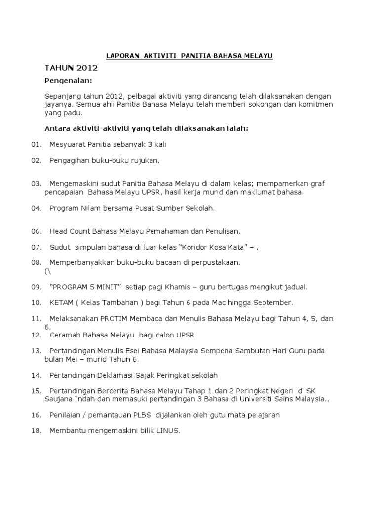 Laporan aktiviti panitia bahasa melayu. Mesyuarat ajk pada 6 januari dan 22 mac. Sepanjang tahun 2011 pelbagai aktiviti yang dirancang telah dilaksanakan dengan jayanya. Kertas kerja program kertas kerja 1 kertas kerja 2 kertas kerja 3 kertas kerja 4 kertas kerja 5 laporan dan post mortem program aktiviti 2011 aktiviti 2012 aktiviti 2013 aktiviti 2014 kad laporan panitia kpi kad laporan panitia bahasa melayu 2011 kad laporan panitia bahasa melayu 2012 kad laporan panitia bahasa melayu.