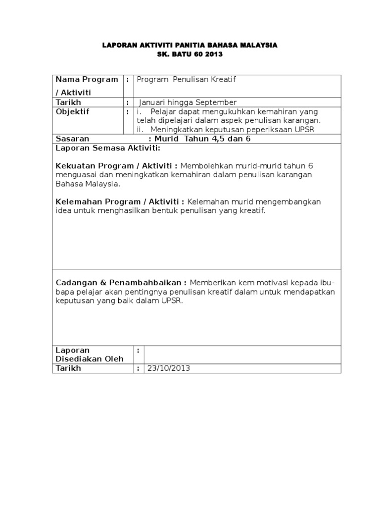 Antara aktiviti aktiviti yang telah dilaksanakan ialah. Laporan aktiviti panitia bahasa melayu. Contoh laporan aktiviti tahunan persatuan bahasa cina contoh laporan aktiviti tahunan persatuan kemahiran contoh laporan aktiviti tahunan persatuan contoh laporan aktiviti panitia contoh laporan aktiviti sukaneka contoh laporan aktiviti pusat sumber contoh laporan keuangan contoh laporan kegiatan contoh laporan penelitian contoh laporan program. Antara aktiviti aktiviti yang telah dilaksanakan ialah.
