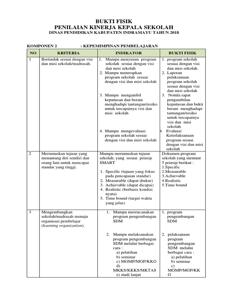 Pelaksanaan tindak lanjut program sekolah. Kinerja sekolah sesuai dengan visi misi tujuan sekolah yang berkaitan dengan bidang manajerial contoh. Program kurikulum dokumen 1 dan dokumen 2 ktsp yang sesuai dengan visi misi dan tujuan sekolah. Pelaksanaan supervisi guru dan kepala sekolah di wilayah binaan sesuai dengan permenpan rb no 16 tahun 2009 tentang jabatan fungsional guru adan angka kreditnya yang diimplentasikan pada pedoman pelaksanaan penilaian kinerja guru pk guru yang dikeluarkan oleh direktorat jendral peningkatan mutu pendidik dan tengan kependidikan kementrian pendidikan nasional tahun 2010 penilaian kinerja guru.