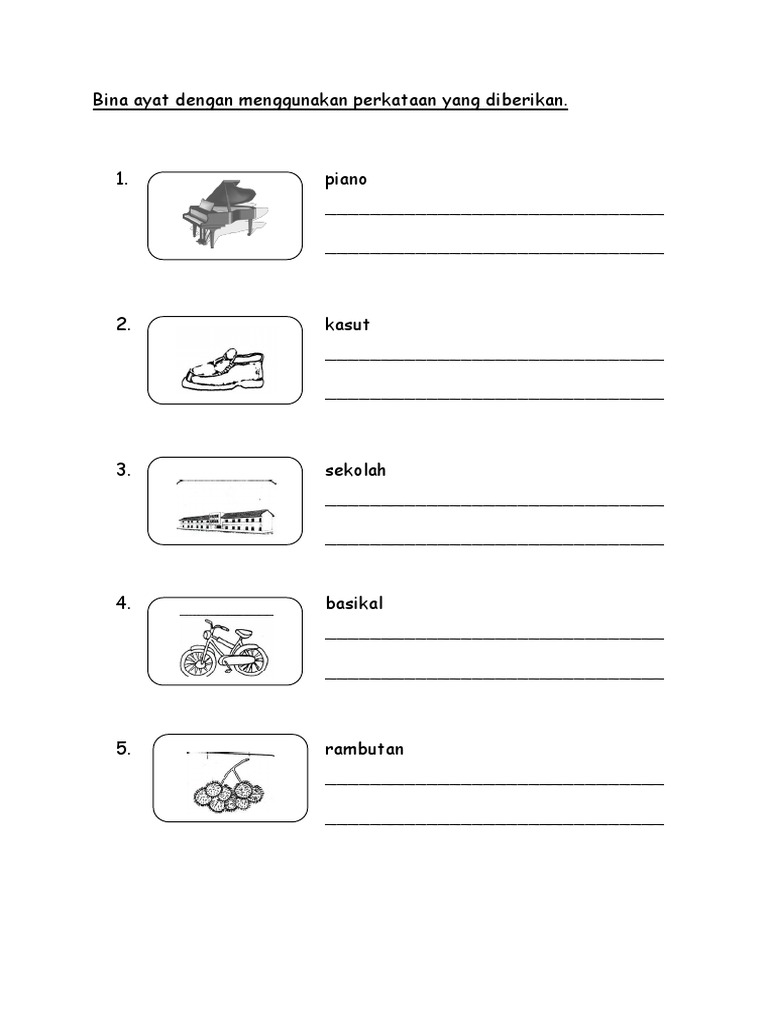 Modul latihan ini sesuai untuk membantu murid yang lemah dalam bm untuk menguasai kemahiran penulisan bm. Bina ayat berdasarkan gambar berikut merupakan bahan latihan penulisan bm. Cikgu chin latihan ini amat sesuai untuk murid tahun 1. Penggunaan kata kerja frasa kerja merupakan elemen yang penting dalam soalan bahagian a bina ayat dalam bm kertas 2.