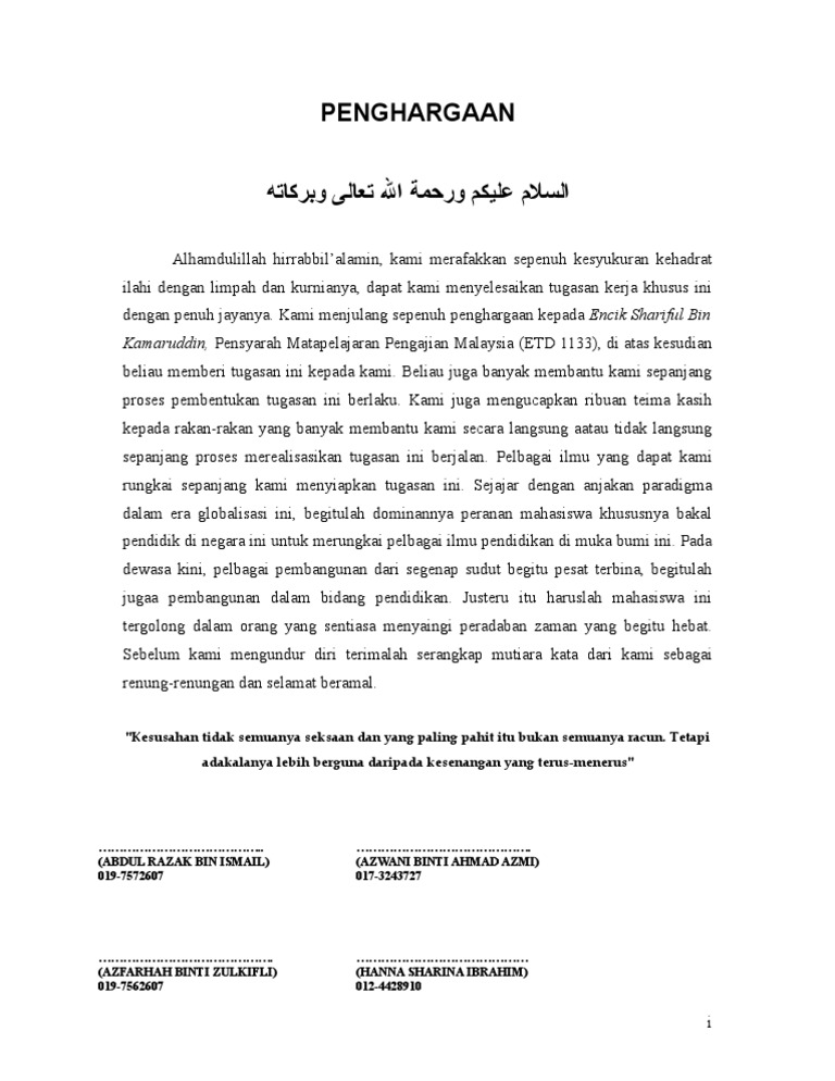 Penghargaan contoh ipgm kampus darulaman posted 3rd may 2011 by anynomus. Bagi memudahkan lagi proses pemarutan kelapa projek ini bertujuan untuk memarut kelapa dengan lebih selamat selesa dengan bunyi yang tidak bising dan mudah untuk dibawa kemana sahaja. Akhir kata saya sekali lagi ingin mengucapkan setinggi tinggi penghargaan dan terima kasih kepada semua pihak yang terlibat sama ada secara langsung atau tidak langsung dalam penghasilan buku laporan saya ini. Tunjukkan lagi tunjukkan kurang.