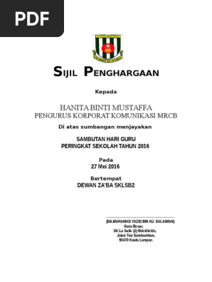Majlis penyampaian sijil penghargaan kecemerlangan kokurikulum hari anugerah cemerlang dan hari jalinan mesra 2013 ibu bapa penjaga murid murid tahun 1 hingga 6 prasekolah dan ppki. Anda di halaman 1 dari 2. The world s largest digital library. Oct 28 2015 carlsen.