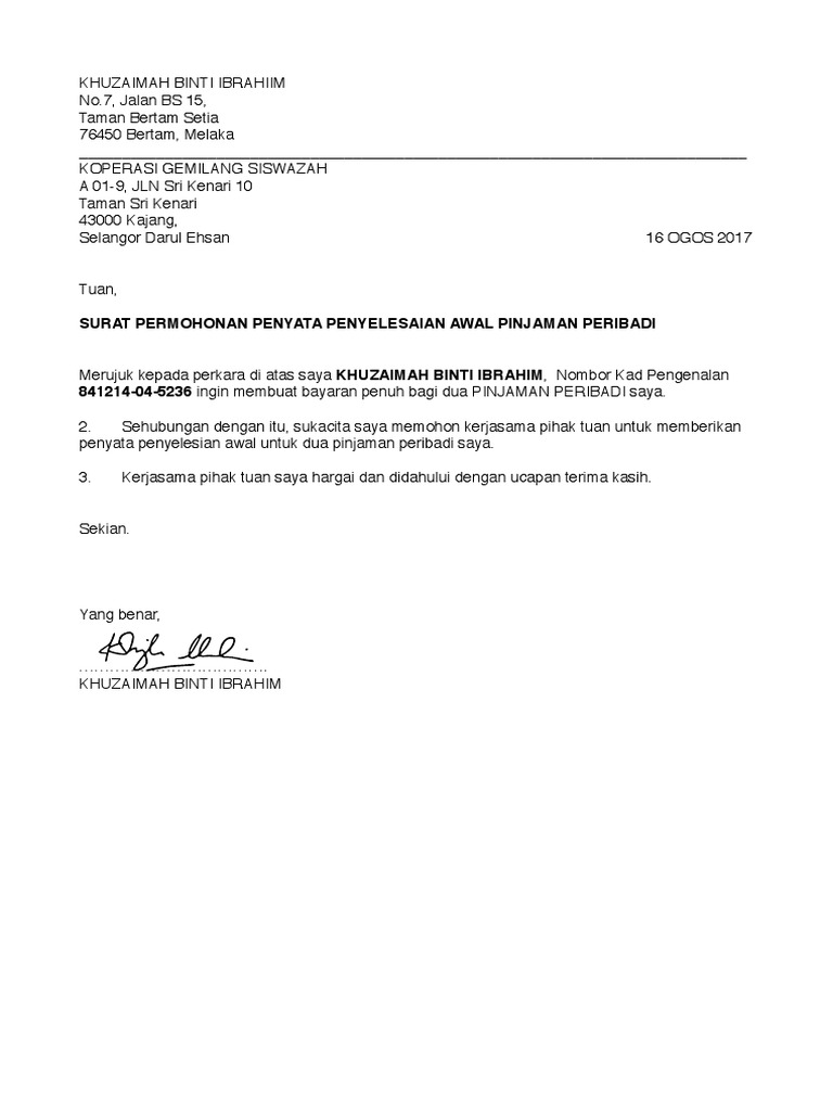 Contoh surat permohonan penyelesaian pinjaman peribadi. Kakak saya novita telah ditipu empat kali dan kehilangan kira kira rm 25 000 untuk. Contoh surat permohonan pinjaman wang syarikat. Perkhidmatan ekstra dari smartpinjaman. Surat permohonan pembayaran penuh pinjaman peribadi.
