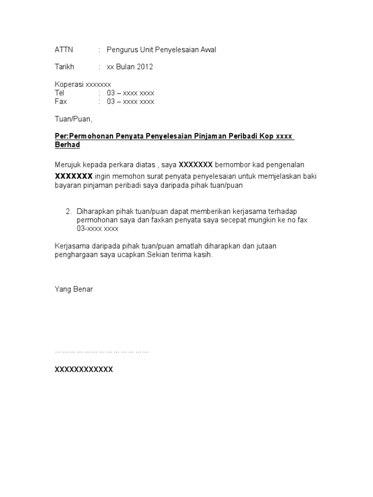 Panduan kini contoh surat rasmi penyelesaian hutang. Jutawan online searching for. En haffis 012 774 0170 pn solihah 012 664 0170. Mohon pihak tuan dapat menghantarkan kepada saya penyata baki hutang terkini saya bagi tujuan penyelesaian.