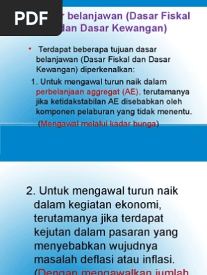 Dasar kewangan dan kesannya ke atas kegiatan ekonomi 24 25. Dasar fiskal diumumkan setiap tahun sedangkan dasar monetari adalah untuk lebih banyak masa kerana kebanyakannya berubah dengan perubahan dalam keadaan ekonomi negara. Untuk mencapai pengagihan pendapatan yang lebih saksama dengan merapatkan jurang kekayaan antara golongan kaya dan miskin. Dasar fiskal mengembang mengatasi masalah deflasi pengangguran kemelesetan ekonomi.