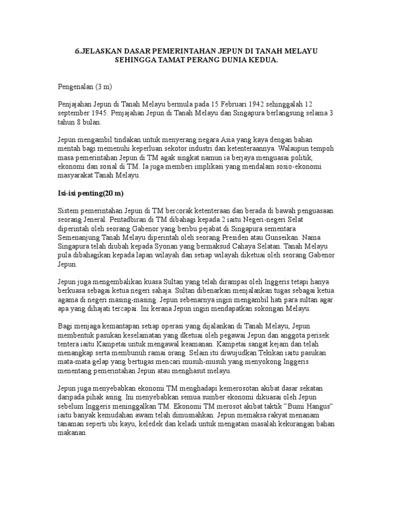 Pendaratan serentak di pantai sabak kota bharu dan singgora dan pattani di thailand 8 disember 1941 sejarah tingkatan tiga bab 1. Kaum melayu diberikan keistimewaan untuk mendapatkan sokongan daripada orang melayu orang cina diberikan layanan yang buruk kerana orang cina telah membantu british menentang jepun teks ini diambil daripada buku tingkatan 5 dan internet. Push button digunakan dalam aplikasi multimedia. Gerakan nasionalisme di tanah melayu sehingga perang dunia ke dua soalan 5 tema 10 bab 2 esei terangkan bagaimana pendudukan jepun menjadi pemangkin gerakan nasionalisme di tanah melayu nota ringkas dasar pemerintahan ketenteraan jepun.