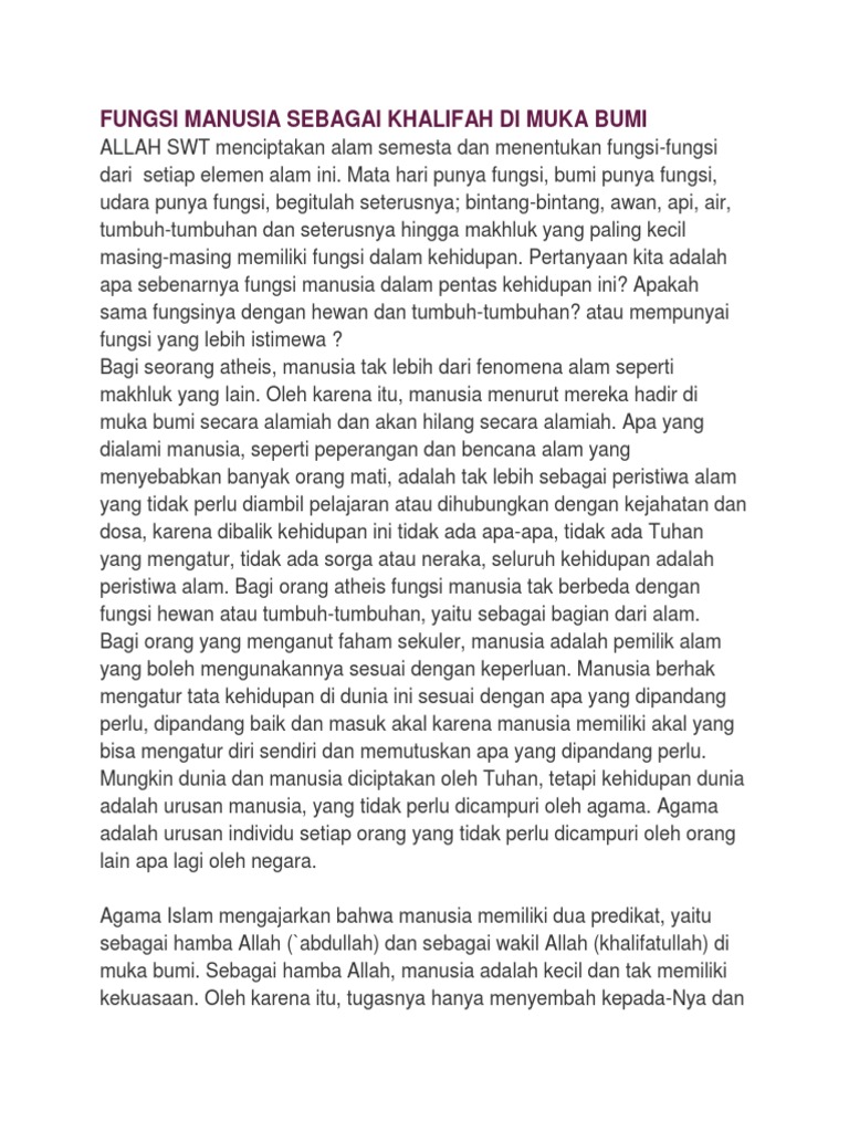 Tugas manusia sebagai khalifah dimuka bumi sebagaimana firman allah dalam surat al baqarah ayat 30. Manusia diciptakan oleh allah swt.