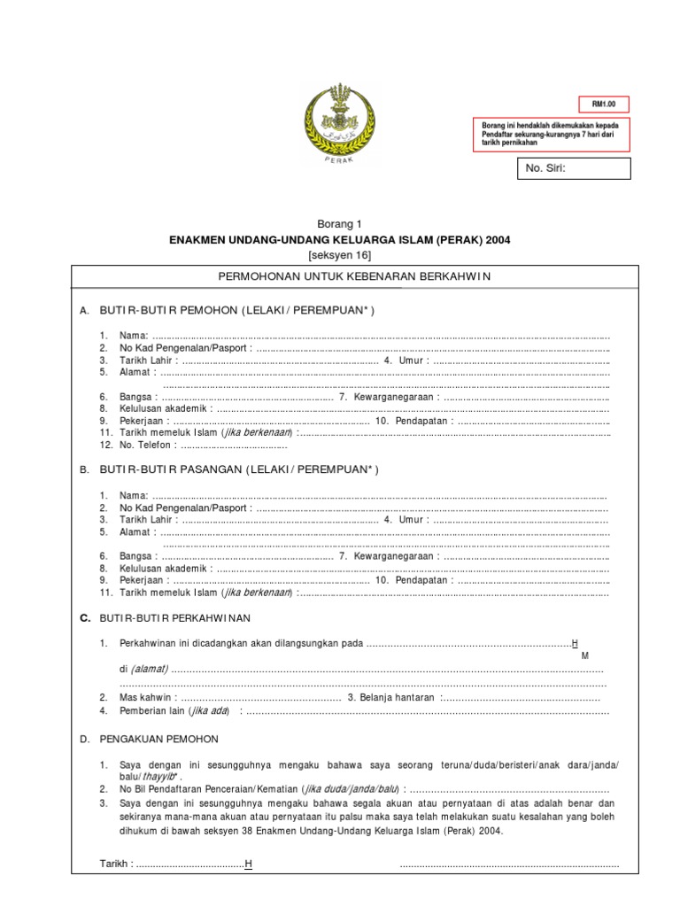 Tarikh persetujuan diraja. Sila cetak permohonan ini dalam dua salinan a. 6 najibah mohd zin perceraian dalam undang undang keluarga islam dalam undang undang keluarga islam ed. Pengiktirafan perkahwinan orang islam yang dilakukan di luar negeri perak darul ridzuan.