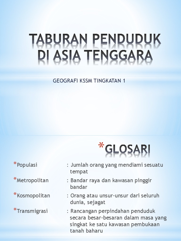 Geografi tingkatan 1 bab 11 penduduk dan petempatan di asia tenggara. Populasi jumlah orang yang mendiami sesuatu tempat seperti negara negeri dan daerah taburan penduduk sebaran penduduk di sesuatu kawasan di muka bumi metropolitan terdiri daripada bandar raya dan kawasan pinggir bandar kosmopolitan terdiri daripada orang atau unsur unsur dari seluru dunia bersifat sejagat. Lebih separuh daripada penduduk dunia pula tinggal di negara negara asia. Nyatakan jumlah penduduk mengikut negara di asia tenggara sehingga jun 2016 id.