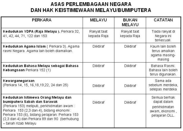 Bukankah terbukti hak istimewa ini gagal melahirkan bangsa melayu yang maju dan berdaya saing. Saya katakan bukan sahaja hak istimewa yang ada perlu dipertahankan bahkan apa yang ada perlu diperkasakan lagi supaya. Hak bahasa melayu sebagai bahasa kebangsaan agama islam sebagai agama rasmi negara serta kedudukan hak istimewa orang melayu dan bumiputera sabah dan sarawak serta kuasa raja raja tidak boleh di sentuh atau dipertikaikan. Hak hak istimewa orang melayu di negeri negeri melayu adalah terjamin selain daripada hak hak istimewa orang melayu dalam perlembagaan persekutuan.