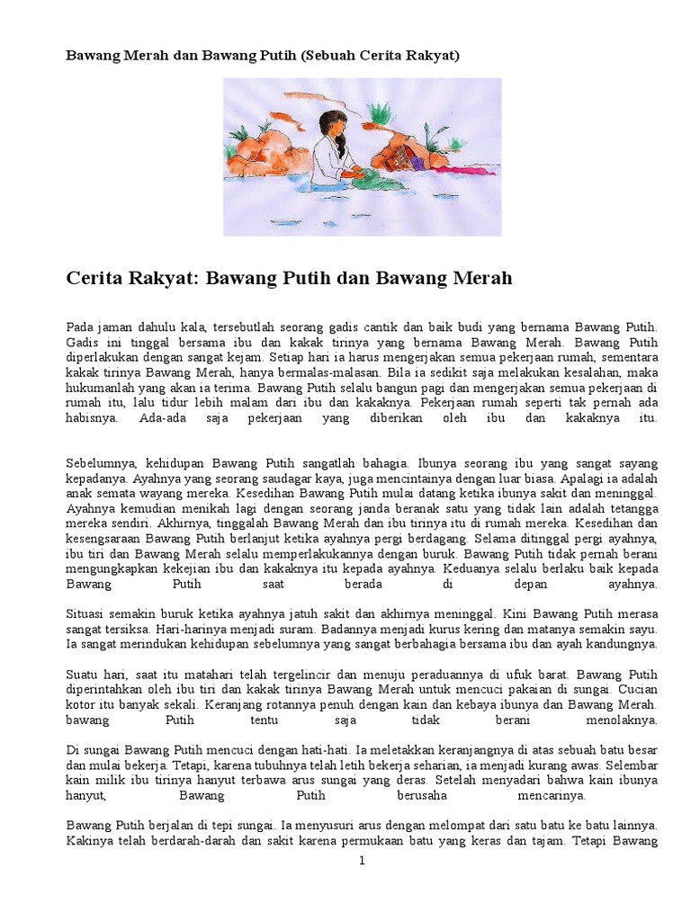 Bawang merah bawang putih merupakan cerita rakyat melayu yang berasal dari provinsi riau. Mendengar cerita bawang putih bawang merah dan ibunya berencana untuk melakukan hal yang sama tapi kali ini bawang merah yang akan melakukannya. Singkat kata akhirnya bawang merah sampai di rumah nenek tua di pinggir sungai tersebut. Cerita rakyat singkat bawang merah dan bawang putih dalam bahasa inggris bawang merah dan bawang putih a long time ago in sumatra tere was a village lived a family consisting of father mother and a beautiful teenage girl named bawang putih.