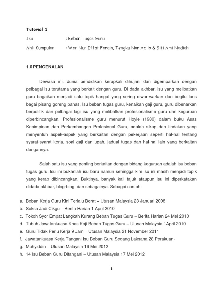 Salah satu isu yang berkaitan dengan bidang keguruan adalah isu beban tugas guru isu ini bukanlah isu baru namun sehingga kini isu ini masih menjadi topik yang kerap dibincangkan buktinya banyak kali tajuk ataupun isu ini diperkatakan di dada akhbar blog blog dan sebagainya sebagai contohnya adalah. Berbalik kepada isu beban tugas yang semakin bertambah isu ini sudah pun lama wujud dan sentiasa menjadi rungutan semua guru. Isu beban tugas guru bukanlah perkara baru dalam dunia pendidikan di malaysia namun ia kembali diperkatakan sejak kebelakangan ini berikutan bebanan tugas yang berlebihan sehingga bukan sahaja mengganggu tugas hakiki guru malah menyebabkan sesetengah guru hidup dalam tekanan kerja. Beban tugas guru telah menjadi satu isu sejak lama dulu.