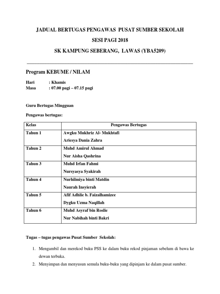 Ceramah kepimpinan peranan pengawas sekolah 1. Jadual waktu bertugas pengawas pusat sumber sk bangsar 2013. Mengutip bayaran yuran bulanan dan lain lain bayaran setelah mendpt keizinan dari guru pengawas. Menyimpan rekod kewangan lembaga pengawas dengan baik 2.
