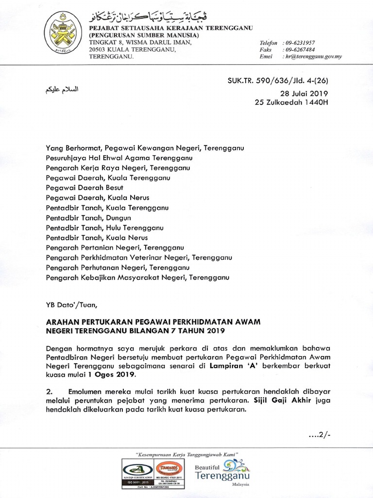 Jawatan tertinggi dalam perkhidmatan awam negeri terengganu. Tarikh tutup 12 julai 2020 terdapat beberapa kekosongan jawatan yang dibuka untuk permohonan oleh pihak spa negeri terengganu calon calon yang berkelayakan adalah dipelawa untuk mengisi kekosongan jawatan tersebut. Walau bagaimanapun lantikan tersebut bersandarkan kepada skim perkhidmatan dan gred jawatan serta kadar gaji yang digunakan dalam perkhidmatan awam. Pejabat setiausaha kerajaan negeri terenggganu tingkat 15 wisma darul iman 20503 kuala terengganu terengganu darul iman tel. Kerja kosong kerajaan swasta mengikut negeri.