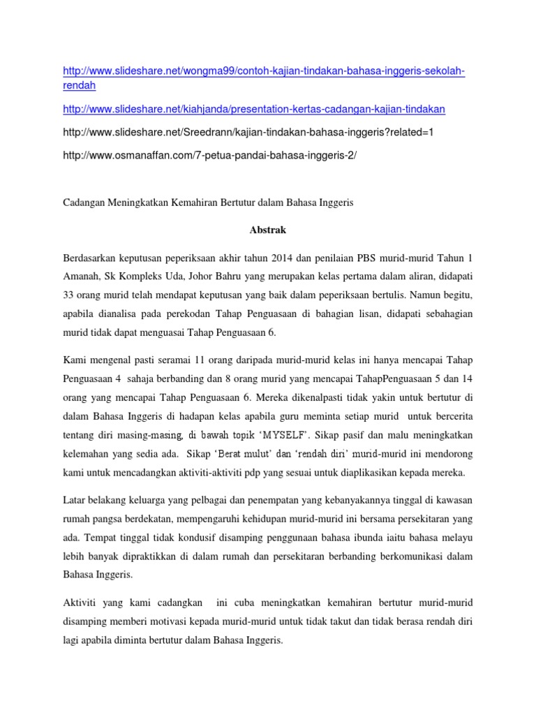 Kajian tindakan bahasa inggeris sekolah menengah. Walaupun saya mengesan banyak masalah yang dihadapi oleh murid saya dalam penulisan karangan saya hanya akan fokuskan kajian ini terhadap masalah penguasaan imbuhan awalan akhiran dan apitan. Kajian ini akan melibatkan 30 orang pelajar tingkatan 3 dalam satu kelas yang diajar oleh guru. Contoh kajian tindakan bahasa inggeris sekolah rendah 1. Murid murid ini adalah dari kelas kedua tetapi tahap penguasaan bahasa inggeris mereka adalah lemah.