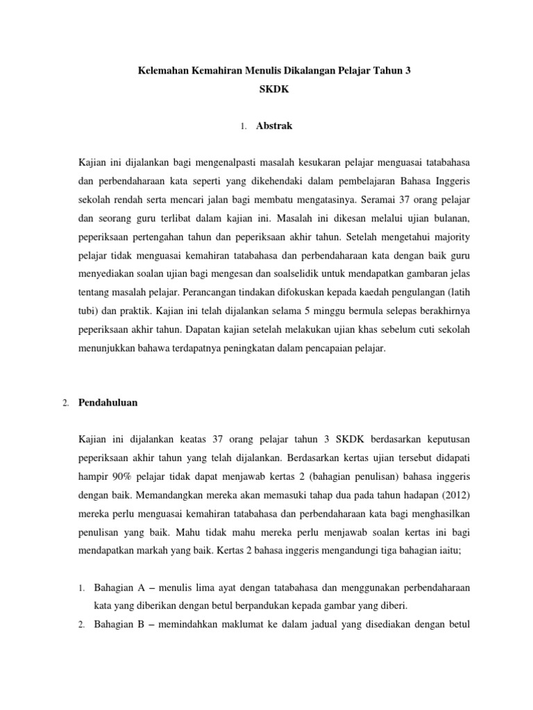 160 seminar penyelidikan tindakan ipg kbl tahun 2012 27 28 september 2012 ipg kbl menambahkan penguasaan kosa kata bahasa inggeris dalam. Meningkatkan penguasaan pelajar tingkatan 3 anggerik terhadap tajuk sistem peredaran darah manusia melalui kaedah nyanyian. Meningkatkan sebutan bahasa inggeris pelajar tahun dua. Contoh kajian tindakan bahasa inggeris sekolah rendah 1.