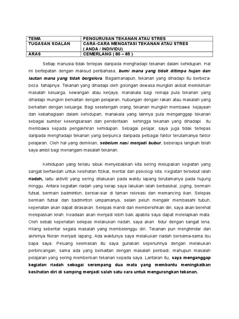 Contoh karangan usaha menangani stress contoh karangan spm usaha usaha yang perlu anda lakukan untuk menangani stres pilih satu daripada soalan di bawah dan tulis sebuah karangan yang panjangnya lebih daripada 350 patah perkataan. Cara cara anda mengatasi tekanan stres. Dengan beban gst yang membelenggu perbelanjaan harian masalah rumah. Bukan sahaja melepaskan endorfin dan membantu melancarkan peredaran darah malah memberi saya ruang untuk berfikir dan mencari ilham.