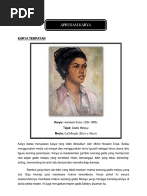 Karya diatas merupakan karya yang telah dihasilkan oleh mohd hossein enas. Bogor kepulauan indonesia tahun lahit. Disini saya ingin memperkenalkan seniman kita iaitu dato hoessein enas. Gadis melayu 1950 cat minyak 49 x 39 cm mohamed hoessein enas dilahirkan di bogor jawa indonesia pada tahun 1924.