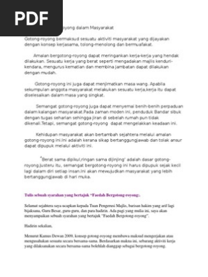 Bak kata perpatah berat sama dipikul ringan sama dijinjing dan bagai aur dengan tebing itulah kata kata yang boleh mengeratkan hubungan silaturrahim dikalangan kaum di malaysia. Aktiviti gotong royong masih banyak dilakukan di kampung kampung dan kurang dilakukan di bandar pada masa ini. Jelaslah amalan ini memberikan satu suntikan baru tentang konsep bekerjasama antara masyarakat terutama di kawasan urbanisasi. 2 gotong royong adalah kerjasama tidak beriman salah seorang diantara kamu sampai ia mencintai saudaranya sama dengan mencintai dirinya sendiri.