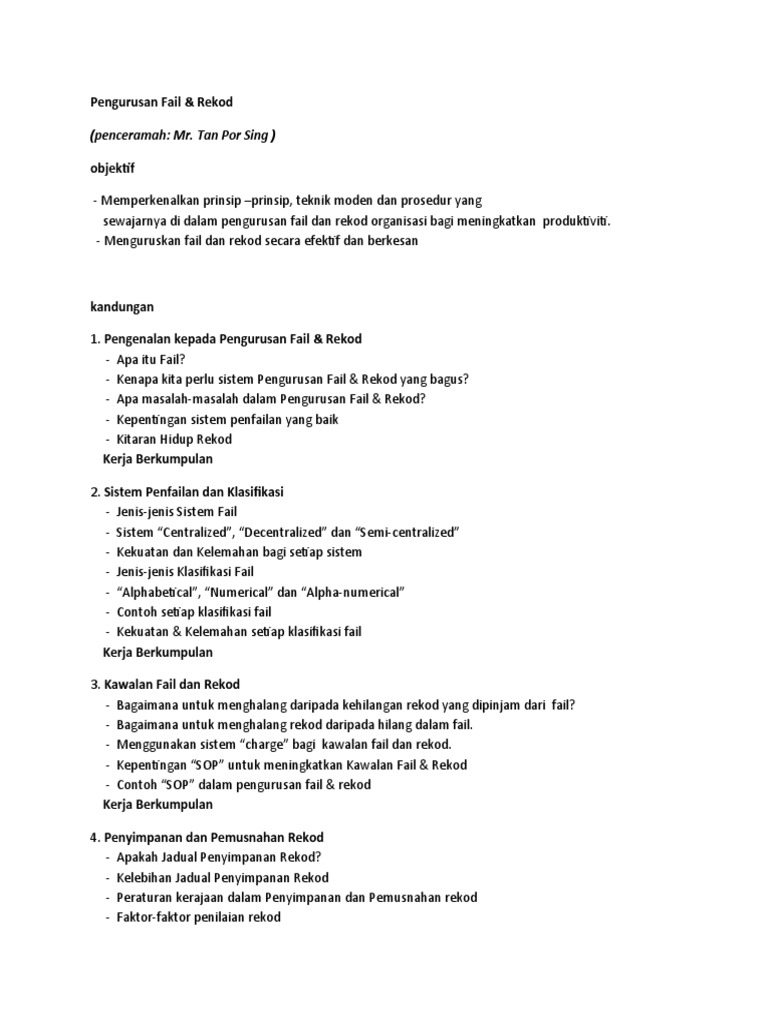 Pada masa kini terdapat pelbagai kaedah diamalkan secara berlainan antara satu agensi dengan satu agensi yang lain dan sering dianggap sebagai tugas mudah remeh serta jarang. Objektif kursus selepas menghadiri program latihan ini para peserta akan dapat. Lebih padu terhadap seluruh proses pendokumentasian pengurusan maklumat dokumen rekod dan pengendalian fail rasmi kerajaan hendaklah ditangani dengan lebih profesional. Pengurusan fail dan rekod penceramah.