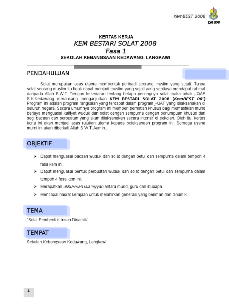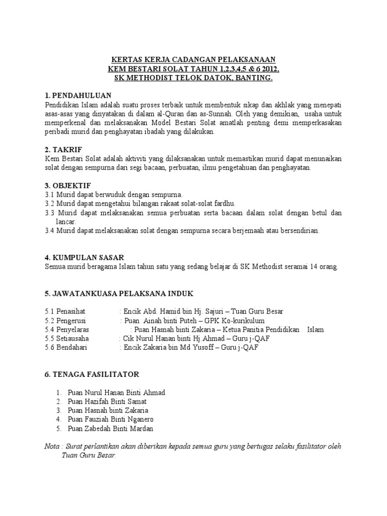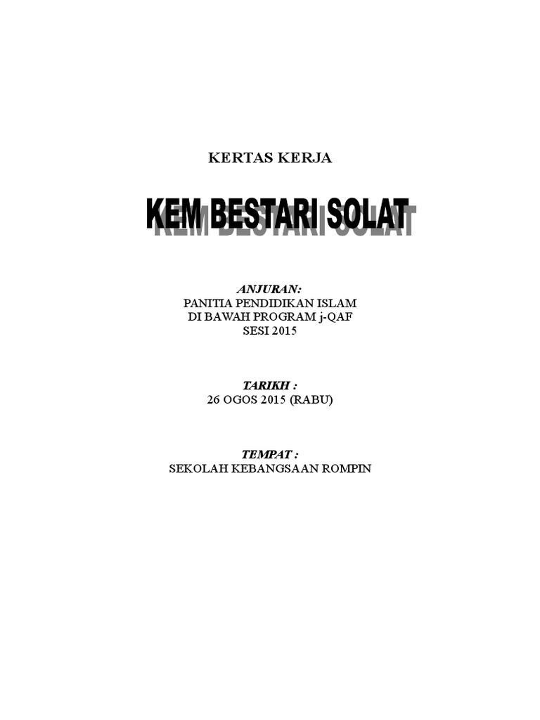 Kertas kerja kem bestari solat 2018. Kertas kerja kem bestari solat sk kampong raja 2019 8 lampiran 2 tentatif program 8 00 pagi sesi pendaftaran dan taklimat kem bestari solat 8 30 pagi latihan dalam kumpulan 1 pengenalan anggota wudhuk dan amali wuduk latihan dalam kumpulan 2 bacaan dalam solat 10 00 pagi rehat dan kudapan 10 30 pagi latihan dalam kumpulan 3 sambungan bacaan dalam solat perlakuan dalam. Kem bestari solat ini kebiasaannya dianjurkan selama satu hari dan pada waktu cuti hujung minggu. Kertas kerja dan modul kem bestari solat. 15 mei 2018 hari.