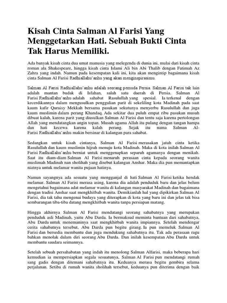 Kisah cinta salman al farisi. Sebagaimana kisah beliau dlm mencari kebenaran dlm agama kesungguhan dan ketabahan beliau sehinggalah menemukan agama islam sbg agama benar begitu jugalah hebatnya kisah cinta salman al farisi. Kisah cinta salman al farisi 20 sep saya adalah abu darda dan ini adalah saudara saya salman al farisi demikian abu darda mengawali pertemuannya dengan orang tua seorang gadis yang akan dipinangnya. Pilihan menurut akal sehat. Maka di kota inilah salman al farisi radhiallahu anhu berniat untuk menggenapkan separuh agamanya dengan menikah.