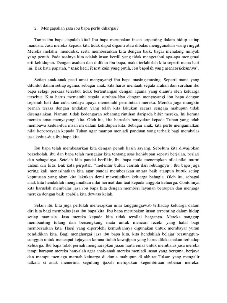 Mengenang jasa ibu bapa esei moral. Menjadi contoh teladan yang baik kepada anak anak. Sentiasa berada di samping mereka terutama apabila ibu bapa sudah uzur dan tua. Mereka sanggup menengking ibu bapa yang sudah tua dan uzur malah ada juga sanggup mendera atau menghalau ibu bapa mereka. Semoga kita semua menjadi anak anak yang soleh dan solehah.