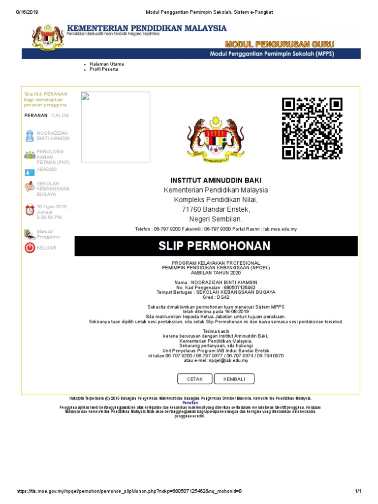 Semakan panggilan pentaksiran bagi program kelayakan profesional pemimpin pendidikan kebangsaan npqel ambilan tahun 2019 boleh dilakukan melalui sistem dalam talian modul penggantian pemimpin sekolah mpps npqel mulai. Urusan berkaitan permohonan kenaikan pangkat dan pautan untuk kembali ke sistem epangkat. Https tls moe gov my login php syarat umum i. Manual pengguna modul penggantian pemimpin sekolah mpps manual pengguna tatacara pengisian maklumat peribadi bagi tujuan tapisan keutuhan sprm manual pengguna permohonan dg42 muat turun borang.
