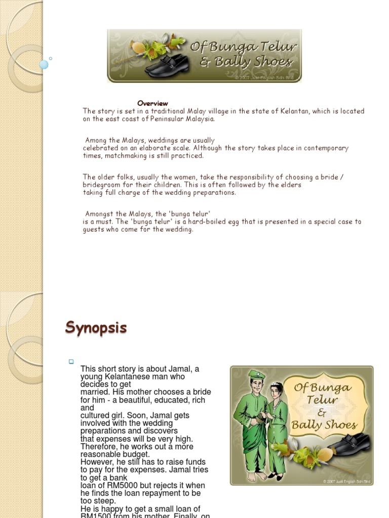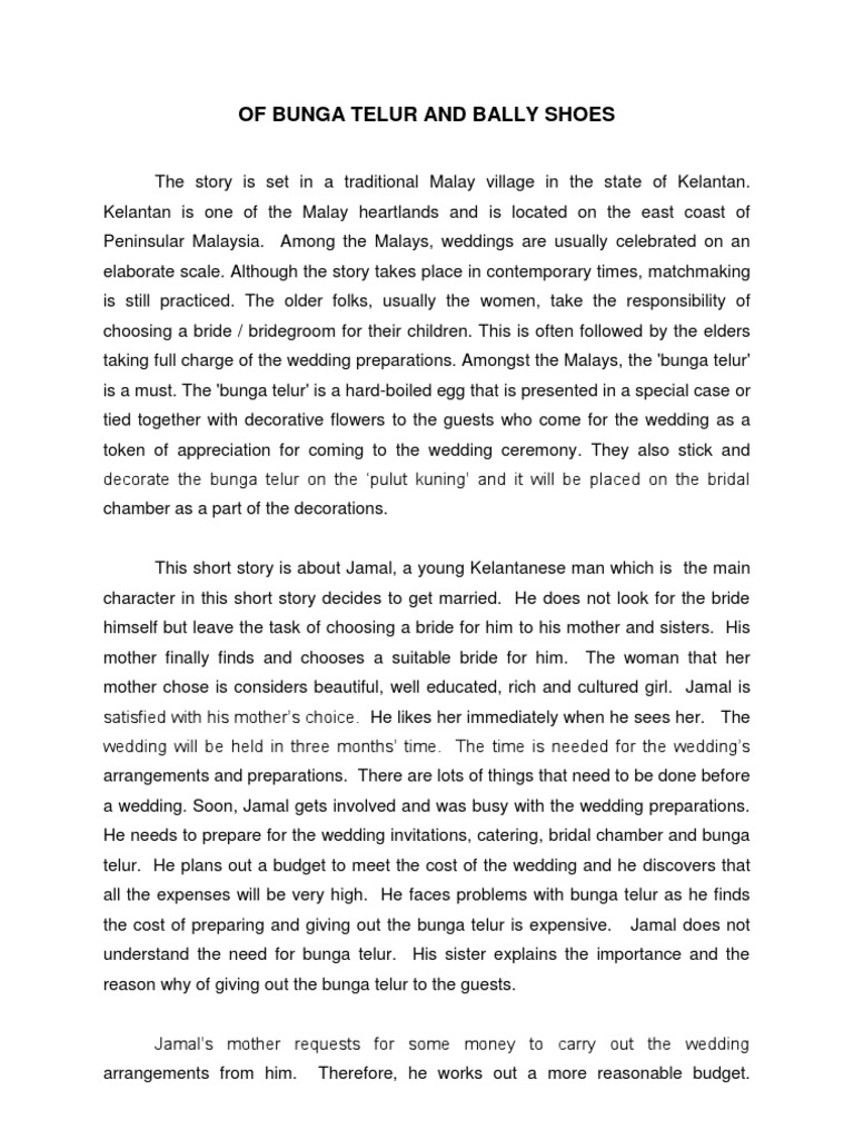 Of bunga telur and bally shoes. However there is always another side of the story and in this short film we look at the short story from two different perspectives. Among the malays weddings are usually celebrated on an elaborate scale. His mother finally found a suitable choice pretty well educated and the scion of a family that his mother would not be ashamed to introduce as in laws. Bunga telur bally shoes free download as powerpoint presentation ppt pptx pdf file pdf text file txt or view presentation slides online.