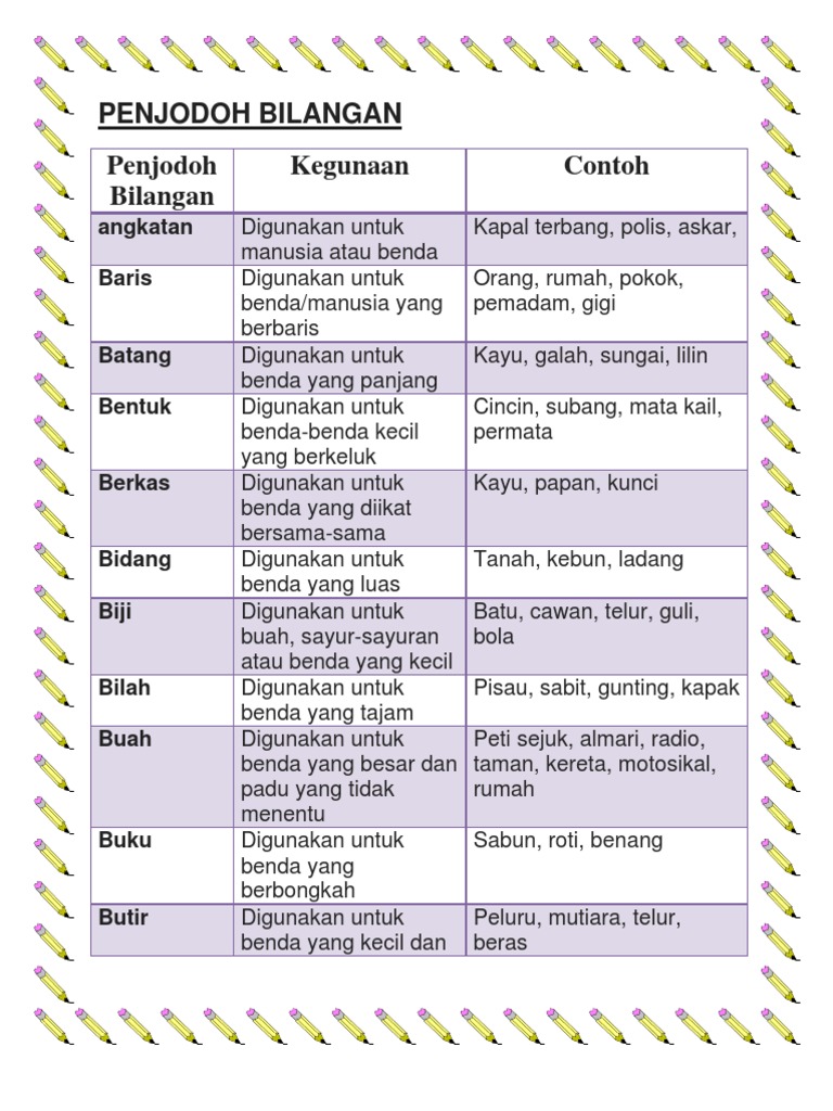 Digunakan untuk benda yang besar dan padu yang tidak menentu. Penjodoh bilangan digunakan bersama sama dengan kata bilangan. Bunga jemput untuk benda benda yang diambil dengan hujung jari nasi garam gula ikan bilis udang kering kajang untuk benda benda yang lebar atap kertas kaki untuk benda benda yang. Berikut saya lampirkan beberapa buah buku yang boleh dijadikan panduan murid murid.