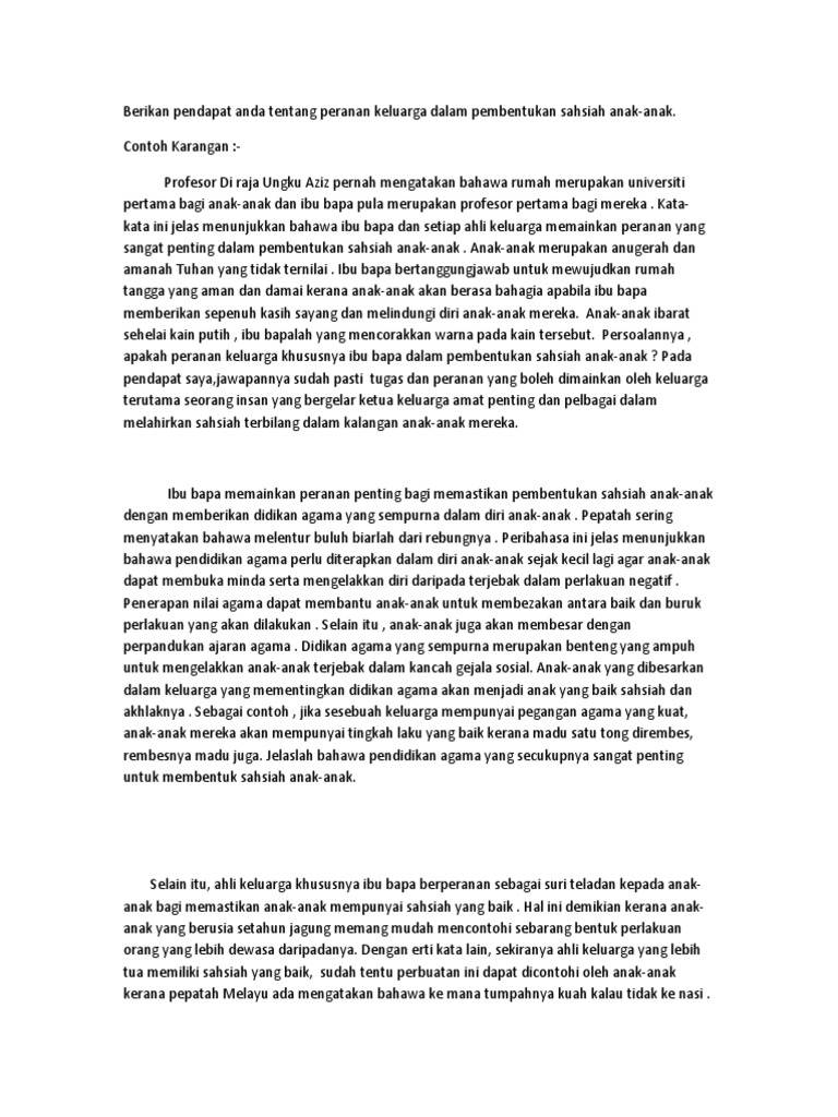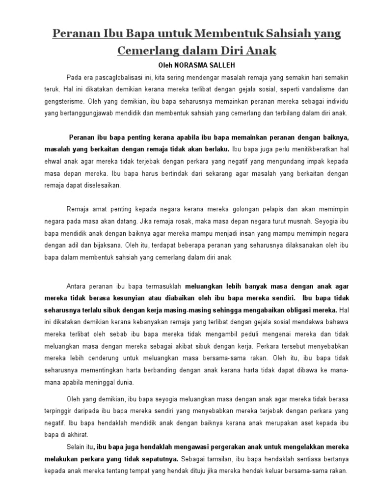 Peranan ibu bapa dalam membentuk sahsiah anak anak sejak kebelakangan ini terdapat pelbagai bentuk masalah sosial dalam kalangan kanak kanak kita haruslah segera membendung perkara ini daripada terus berlaku supaya dapat melahirkan negara yang aman pada masa akan datang namun apakah peranan ibu bapa dalam membentuk sahsiah anak anak. Hal ini membolehkan anak anak untuk sentiasa dekat dengan agamanya. Sememangnya peranan ibu bapa dalam membentuk sahsiah anak anak adalah untuk menyediakan sumber rohani yang kukuh kepada anak anak mereka sekaligus menjauhkan mereka daripada gejala sosial. Ibu bapa seyogia meluangkan masa bersama sama anak agar mereka tidak berasa diri mereka disisihkan.