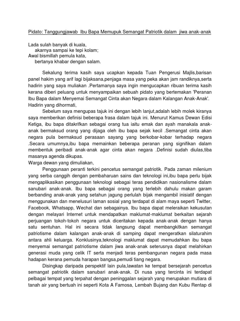 Peranan ibu bapa memupuk semangat patriotik karangan spm. Jelaslah sesungguhnya tidak dapat dinafikan bahawa ibu bapa memainkan peranan yang utama dalam menerapkan dan menyuburkan semangat patriotik dalam jiwa anak anak selain itu ibu bapa juga hendaklah membeli buku buku yang berkaitan dengan sejarah atau buku buku novel bertemakan semangat patriotik dan semangat cinta akan negara kepada anak anak. Peranan ibu bapa memupuk semangat cinta akan negara dalam kalangan anak anak pada era pascaperindustrian dan globalisasi yang serba mencabar akal dan minda malaysia telah menjadi sebuah negara yang sedang membangun di mata dunia selepas kemerdekaan yang disambut pada tanggal 31 ogos 1957. Oleh itu ibu bapa seharusnya mengorak langkah yang lebih proaktif seperti yang terkandung dalam peribahasa sediakan payung sebelum hujan bagi memastikan semangat patriotik tidak luntur dalam kehidupan anak anak mereka. Peranan ibu bapa bagi memupuk semangat cinta akan negara 1 comment pada era pascaperindustrian dan globalisasi yang serba mencabar akal dan minda malaysia telah menjadi sebuah negara yang sedang membangun di mata dunia selepas kemerdekaan yang disambut pada tanggal 31 ogos 1957.