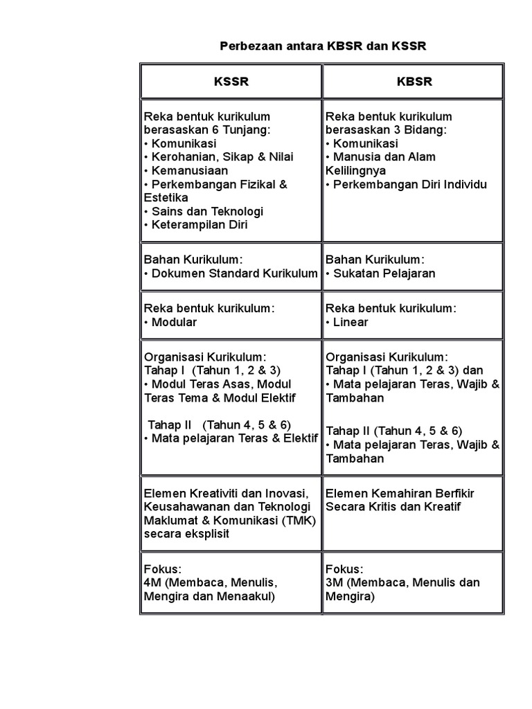 Perbezaan antara kbsr dan kssr. Penjenamaan semula mata pelajaran kssr kepada kssr semakan 2017 berdasarkan jadual di atas terdapat 1 persamaan dan 8 perbezaan antara kssr dengan kssr semakan 2017. Richcroco september 7 2012 at 6 49 pm. Kssr diperkenalkan sebagai satu usaha menyusun semula dan menambah baik kurikulum sedia ada untuk memastikan murid dibekalkan dengan pengetahuan kemahiran dan nilai yang relevan untuk memenuhi keperluan semasa serta menghadapi cabaran abad ke 21. Kurikulum pendidikan sekolah rendah dan pendidikan jawi pimk 3183 pensyarah.