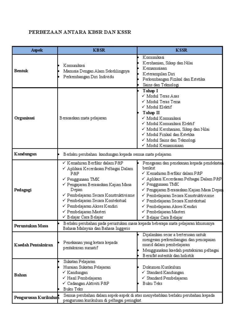 Perbezaan antara kbsr dan kssr aspek. Kssr mula dilaksanakan secara berperingkat mulai tahun 2011. Apa perbezaan kbsr dan kssr dr segi falsafah. Terima kasih cikgu.
