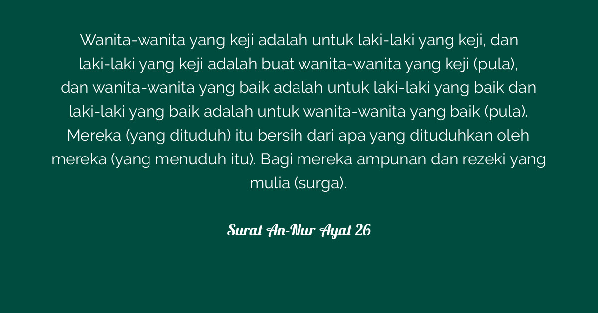 Perempuan yang baik untuk lelaki yang baik surah. Dalam hal ini terjemahan depag menggunakan arti wanita yang baik dan pemahaman ini berangkat dari para ulama yang menyatakan bahwa aisyah merupakan wanita yang baik baik karena konteks ayat tersebut turun satu paket yaitu ayat 11 26 dengan ayat sebelumnya tentang seseorang menuduh wanita yang baik baik berzina. Mereka yang dituduh itu bersih dari apa yang dituduhkan oleh mereka yang menuduh itu. Surat an nur secara umum memang memberikan banyak pengajaran tentang tema kesucian oleh karenanya para ulama sering berpesan agar perempuan muslimah sering membaca surat ini. Salah satu ayat al qur an yang akan membuat anda mengernyitkan dahi adalah surat an nur ayat 26.