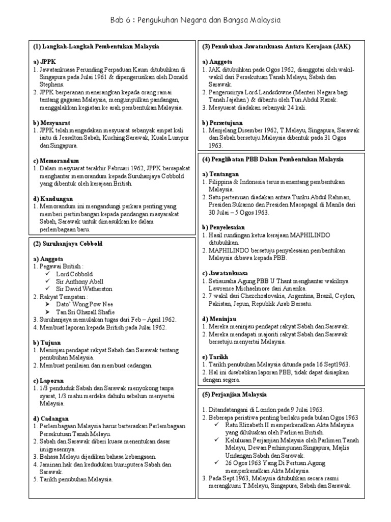 Pengenalan perjanjian persekutuan tanah melayu 1957 telah membawa kemerdekaan kepada persekutuan tanah melayu. F1 perjanjian persekutuan tanah melayu 1957 5 markah f2 kemerdekaan persekutuan tanah melayu f3 negeri negeri dalam persekutuan tanah melayu f4 singapura di luar persekutuan tanah melayu f5 sarawak dan sabah tanah jajahan mahkota f6 ura ura pembentukan malaysia f7 reaksi pembentukan malaysia f8 cabaran pembentukan malaysia 8x1m maksimum 5 2 memahami proses pembentukan malaysia. Sultan sultan melayu dengan british pada 15 ogos 1957 berasaskan perjanjian ptm 1948. 4 cadangkan langkah langkah kea rah kemerdekaan persekutuan tanah melayu 1.