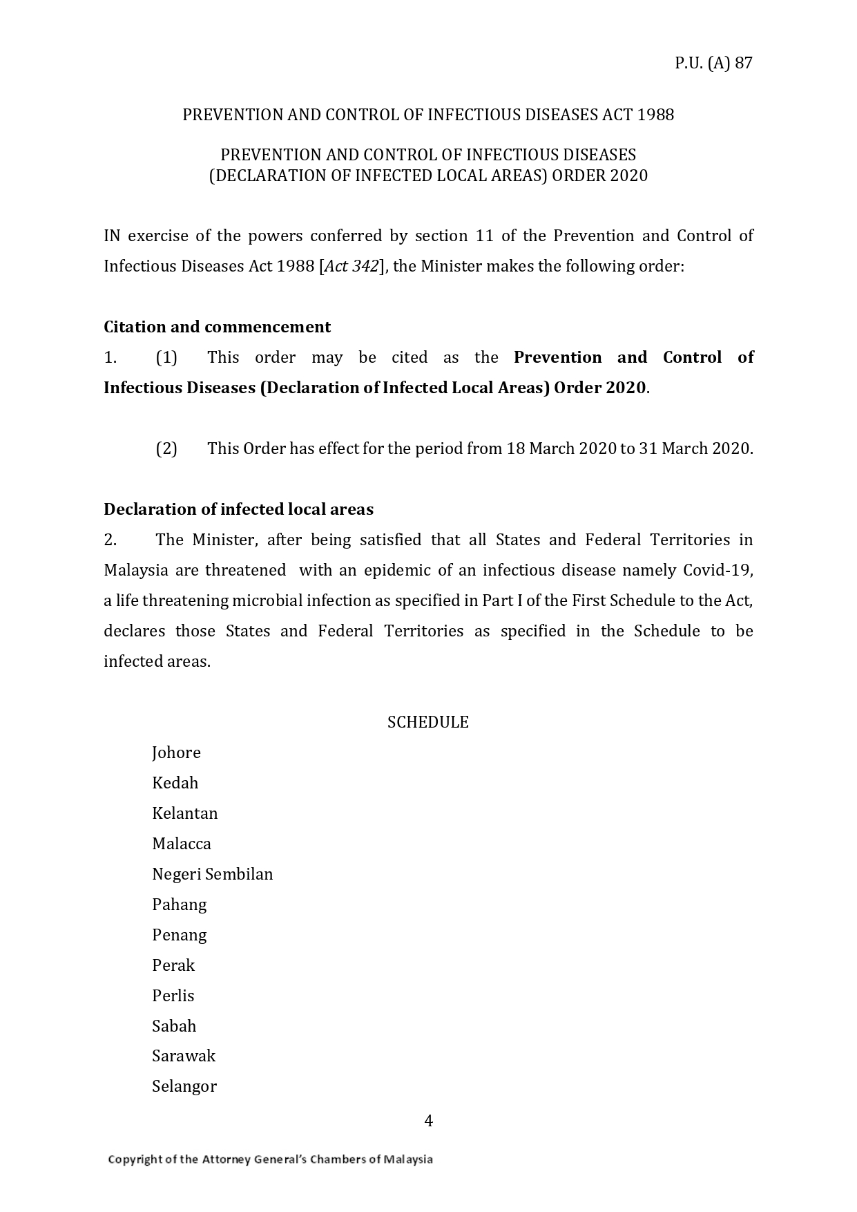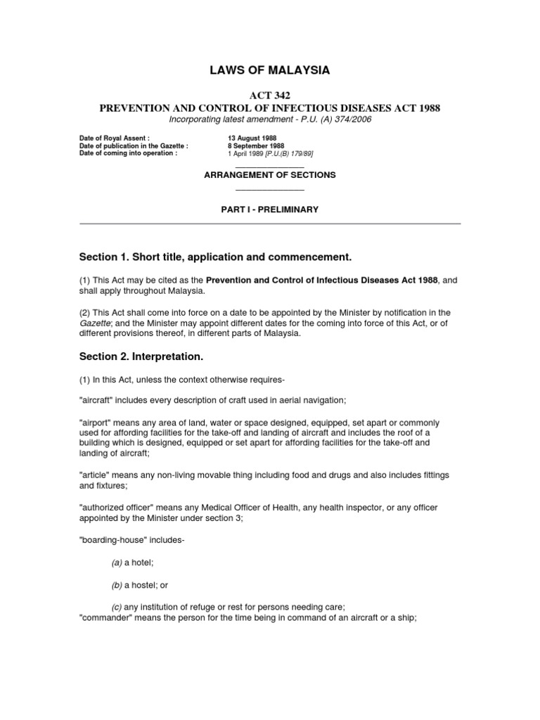 Act 342 prevention and control of infectious diseases act 1988 an act to amend and consolidate the law relating to the prevention and control of infectious diseases and to provide for other matters connected therewith. 2 this act shall come into force on a date to be appointed by the minister by notification in the gazette. And the minister may appoint different dates fo r the coming into force of this act or of different provisions thereof in different parts of malaysia. His majesty s government gazette published by authority in exercise of the powers conferred by subsection 11 2 of the prevention and control of infectious diseases act 1988 act 342 the minister makes the following regulations.