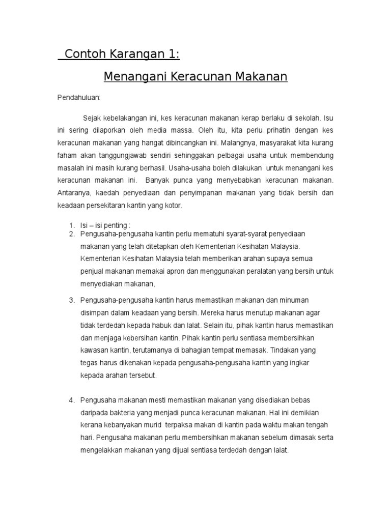 Punca punca keracunan makanan karangan pendek. Dasawarsa ini jumlah keracunan makanan semakin meningkat secara drastik. Kejadian kejadian seperti muntah muntah cirit birit sakit perut malahan sehingga membawa kematian akibat keracunan makanan telah menyebabkan isu ini mendapat perhatian banyak pihak. Terdapat pelbagai punca berlakunya keracunan makanan. Pendek kata penyediaan makanan secara tidak bersih akan menyebabkan kes keracunan makanan berlaku.